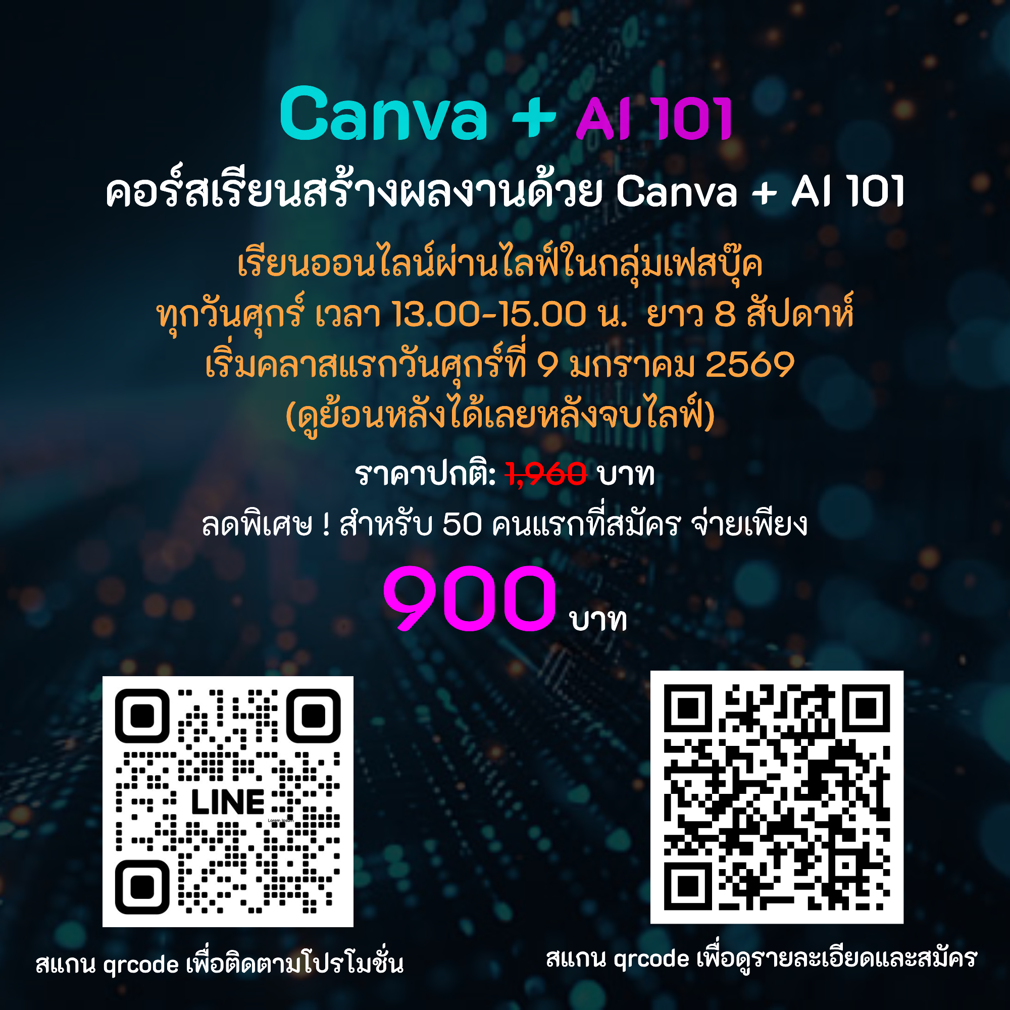สร้างผลงานปังด้วยวิชา Canva + AI 101: เวิร์กโฟลว์ออกแบบ 10 เท่า ในยุคใหม่ คอร์ส 10 ชั่วโมง ที่ออกแบบมาเพื่อคนยุค AI ที่ต้องการ “ทำงานไวขึ้น แต่คุณภาพสูงขึ้น” หาก…