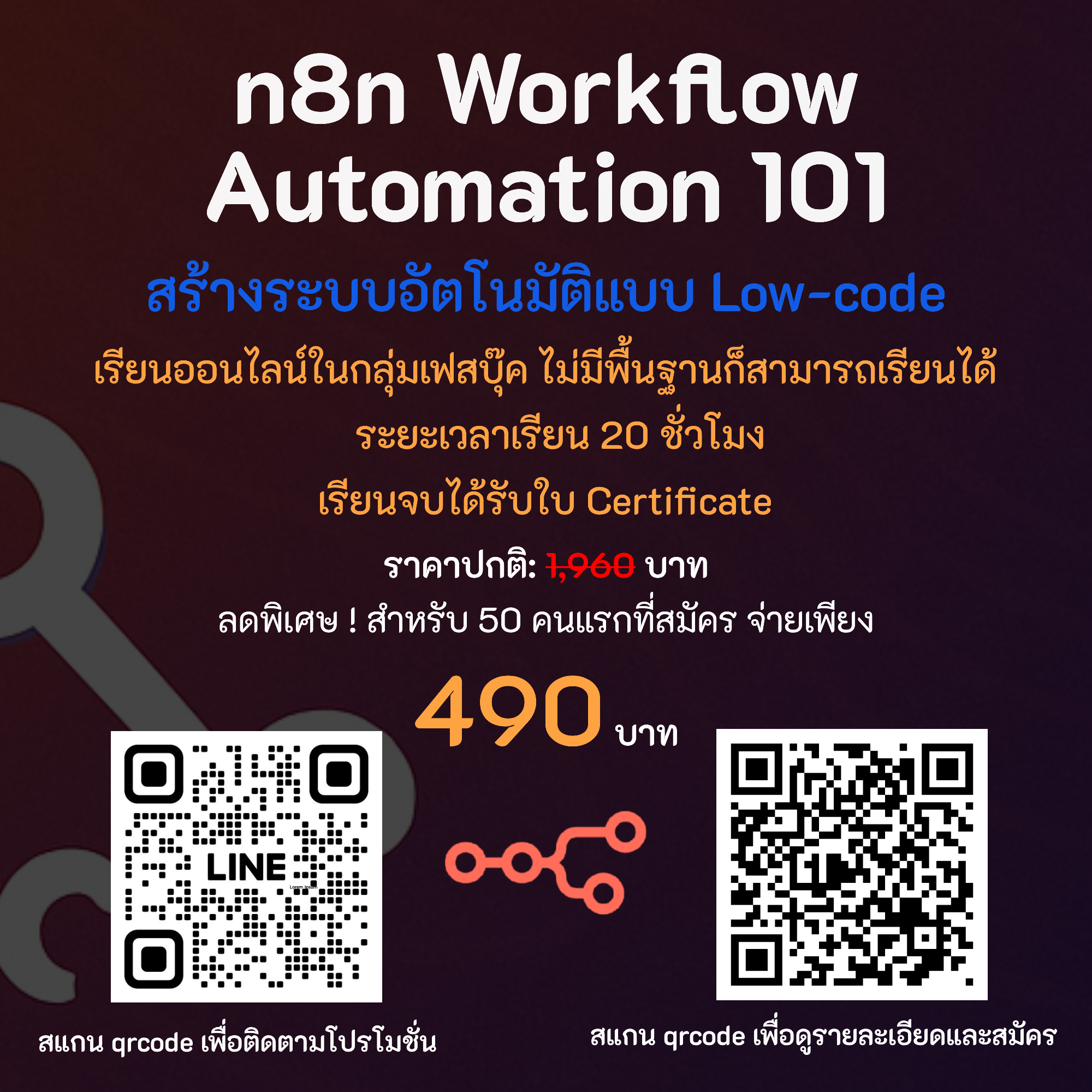 มาแล้ว! วิชาที่หลายคนเรียกร้องมา "n8n Workflow Automation 101" คอร์สนี้จะพาผู้เรียนเข้าสู่โลกของ n8n ซึ่งเป็นเครื่องมือสร้างระบบอัตโนมัติแบบ Low-code โดยเริ่มจากก…