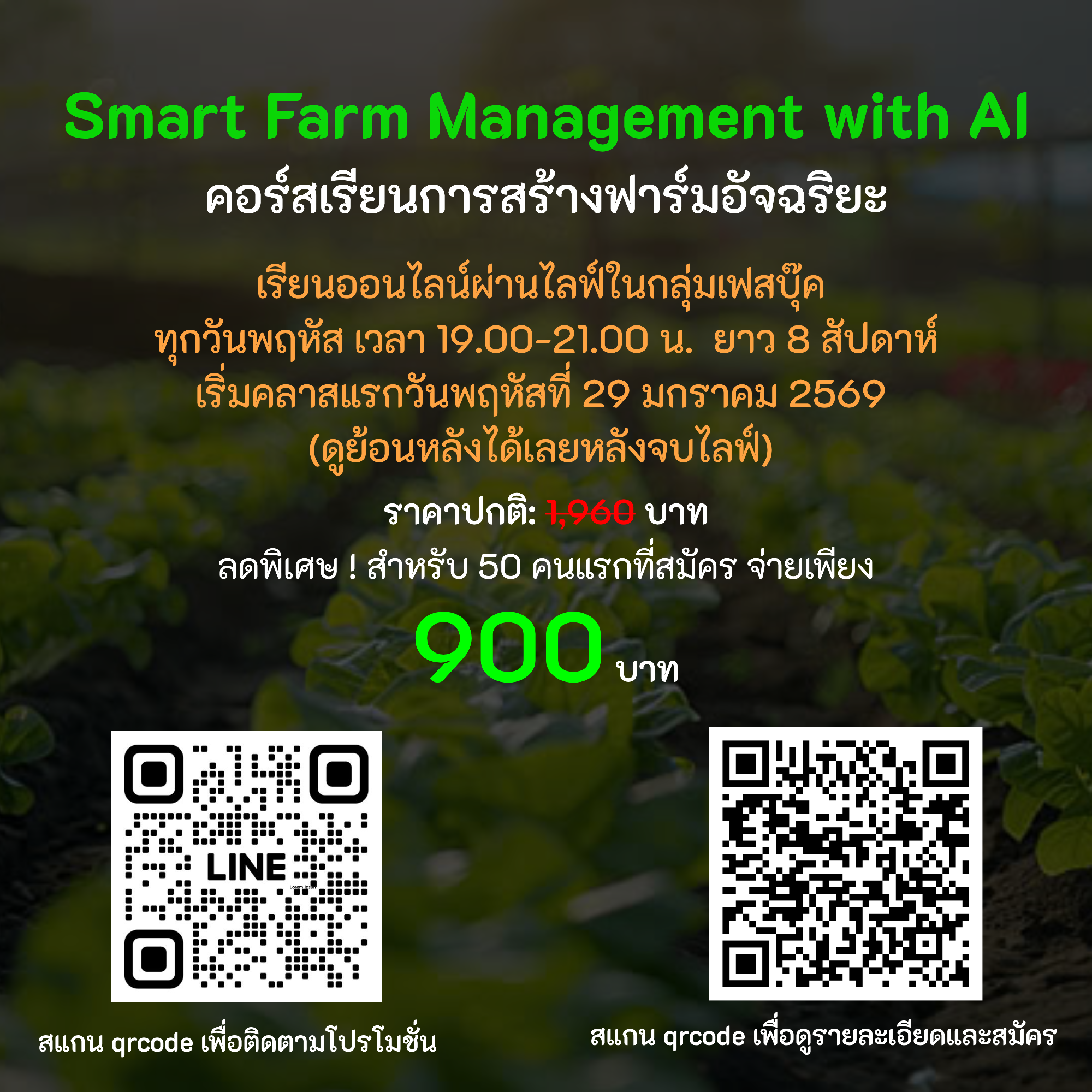 คอร์ส Smart Farm Management with AI จะพาผู้เรียนเข้าสู่โลกการทำเกษตรยุคใหม่ที่ผสาน IoT, Automation และปัญญาประดิษฐ์เข้ากับการบริหารจัดการฟาร์มอย่างเป็นระบบ โดย…