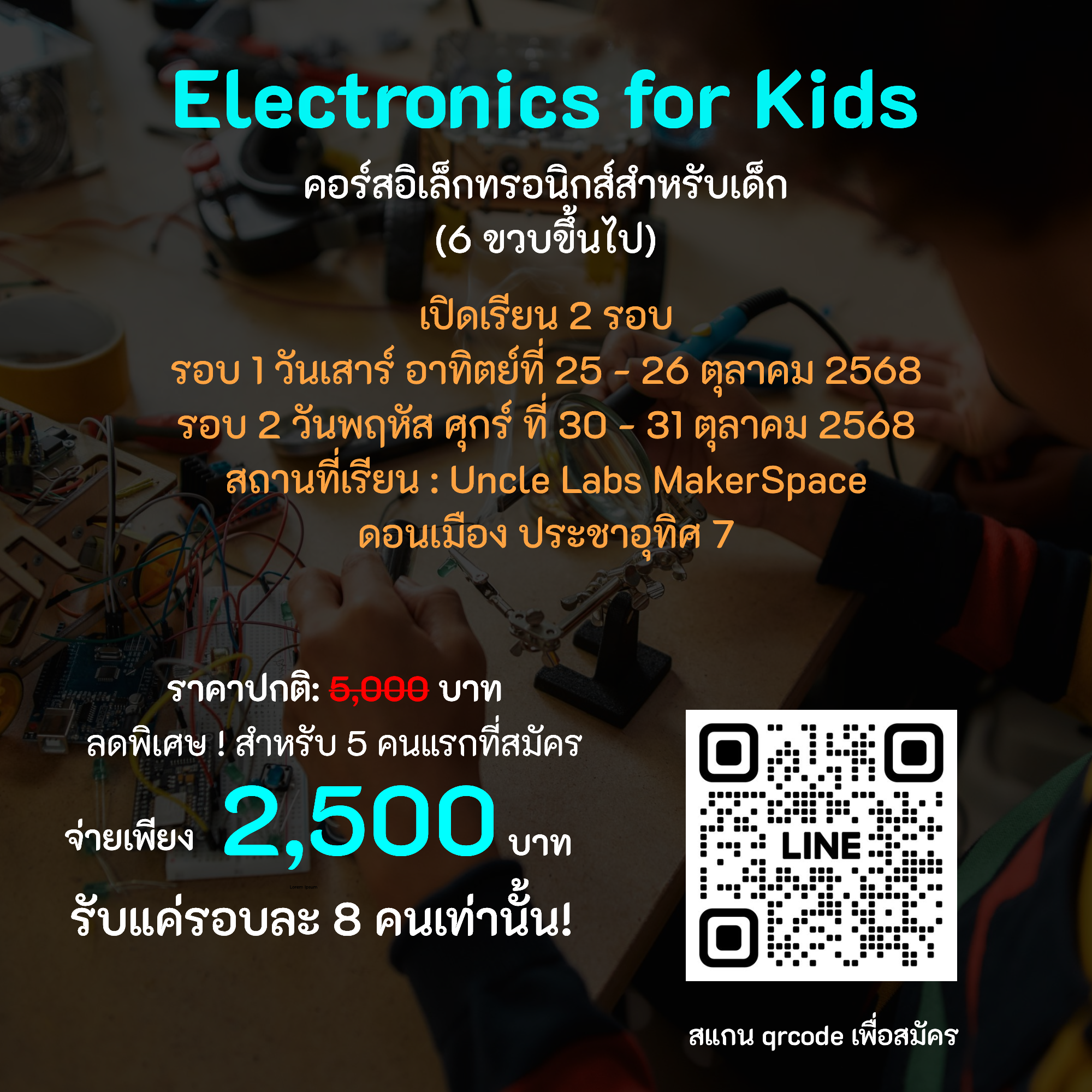 อิเล็กทรอนิกส์สำหรับเด็กเป็นหลักสูตรลงมือปฏิบัติจริง ออกแบบมาเพื่อแนะนำให้เด็ก ๆ รู้จักกับโลกแห่งอิเล็กทรอนิกส์ผ่านกิจกรรมและโครงการที่น่าสนใจโดยผู้เข้าร่วมจะได้รับความเข้าใจพื้นฐานเกี่ยวกับส่วนประกอบอิเล็กทรอนิกส์ วงจร และการสร้างอุปกรณ์อิเล็กทรอนิกส์ง่าย ๆ ด้วยตัวเอง โดยมีทีมงานเป็นพี่เลี้ยงคอยดูแล แนะนำ เพื่อความเข้าใจและความปลอดภัย ตลอดการปฎิบัติการ