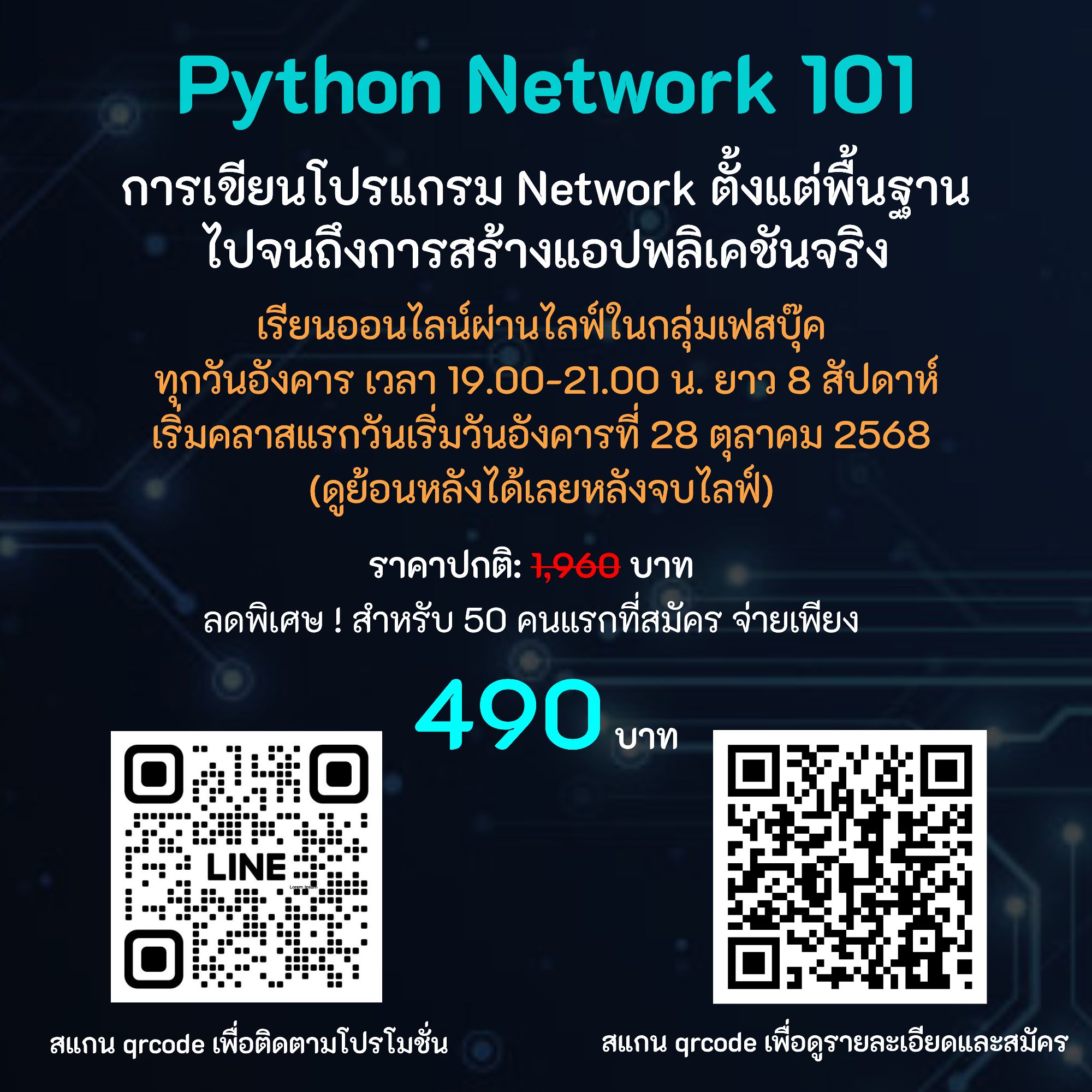 คอร์ส Python Network 101 ถูกออกแบบให้ผู้เรียนได้เข้าใจและลงมือปฏิบัติการเขียนโปรแกรมเครือข่ายตั้งแต่พื้นฐานไปจนถึงการสร้างแอปพลิเคชันจริง เริ่มจากการรู้จักการทำงาน…