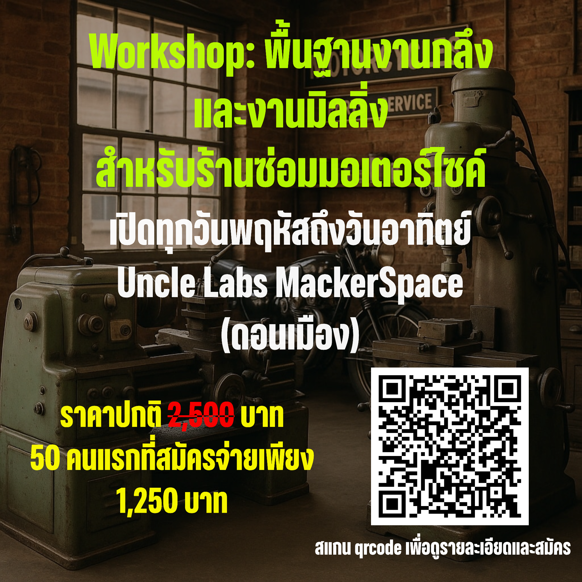 Workshop: พื้นฐานงานกลึง และงานมิลลิ่ง สำหรับร้านซ่อมมอเตอร์ไซค์ ในร้านซ่อมมอเตอร์ไซค์ทั่วไป มักเจอปัญหาอะไหล่หายาก สินค้าหมดสต็อก หรือชิ้นส่วนสึกหรอเกินกว่าจ…