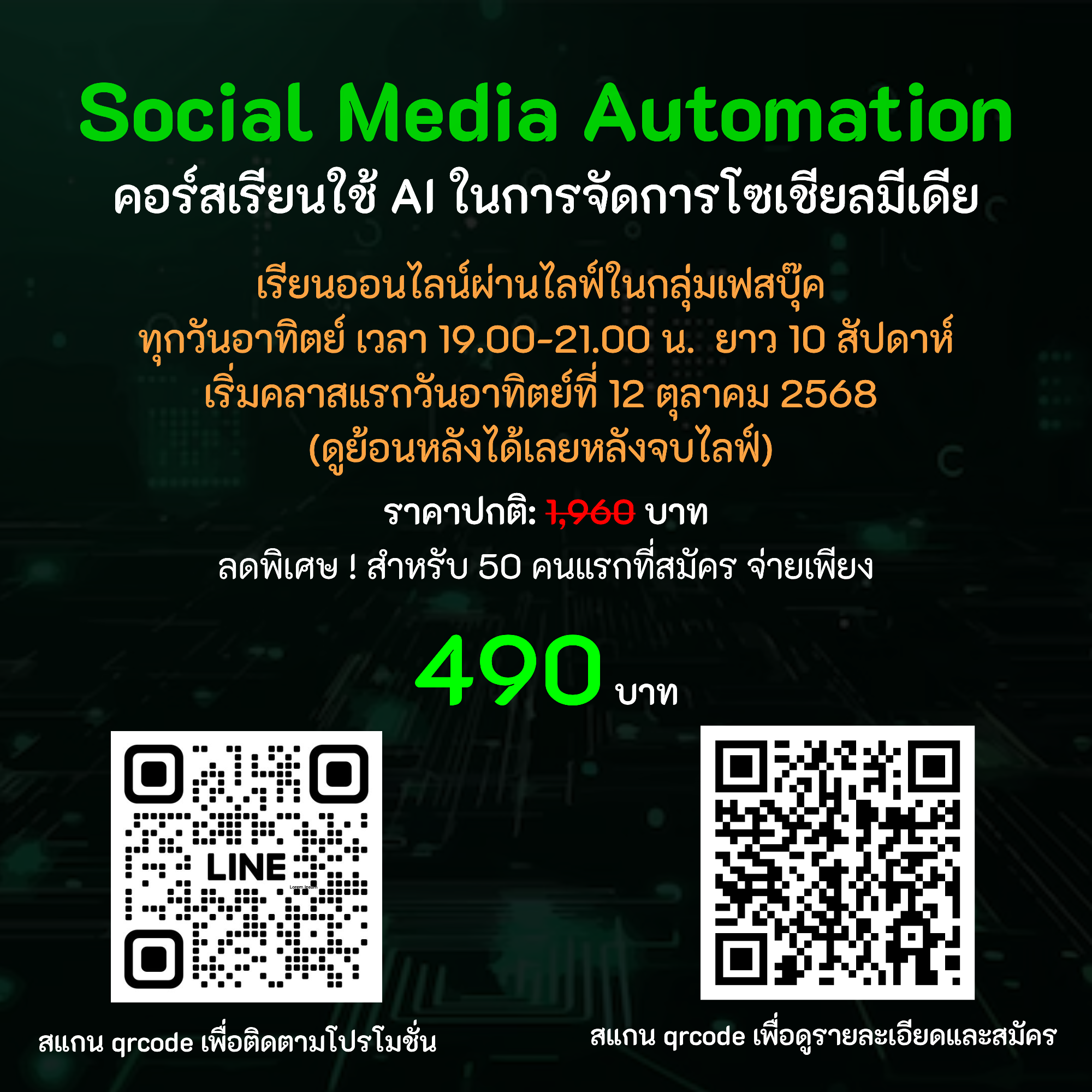 Social Media Automation เป็นคอร์สเชิงปฏิบัติที่จะพาคุณเรียนรู้วิธีใช้เครื่องมืออัตโนมัติในการจัดการโซเชียลมีเดีย ตั้งแต่การวางแผนคอนเทนต์ การตั้งเวลาโพสต์ การ…