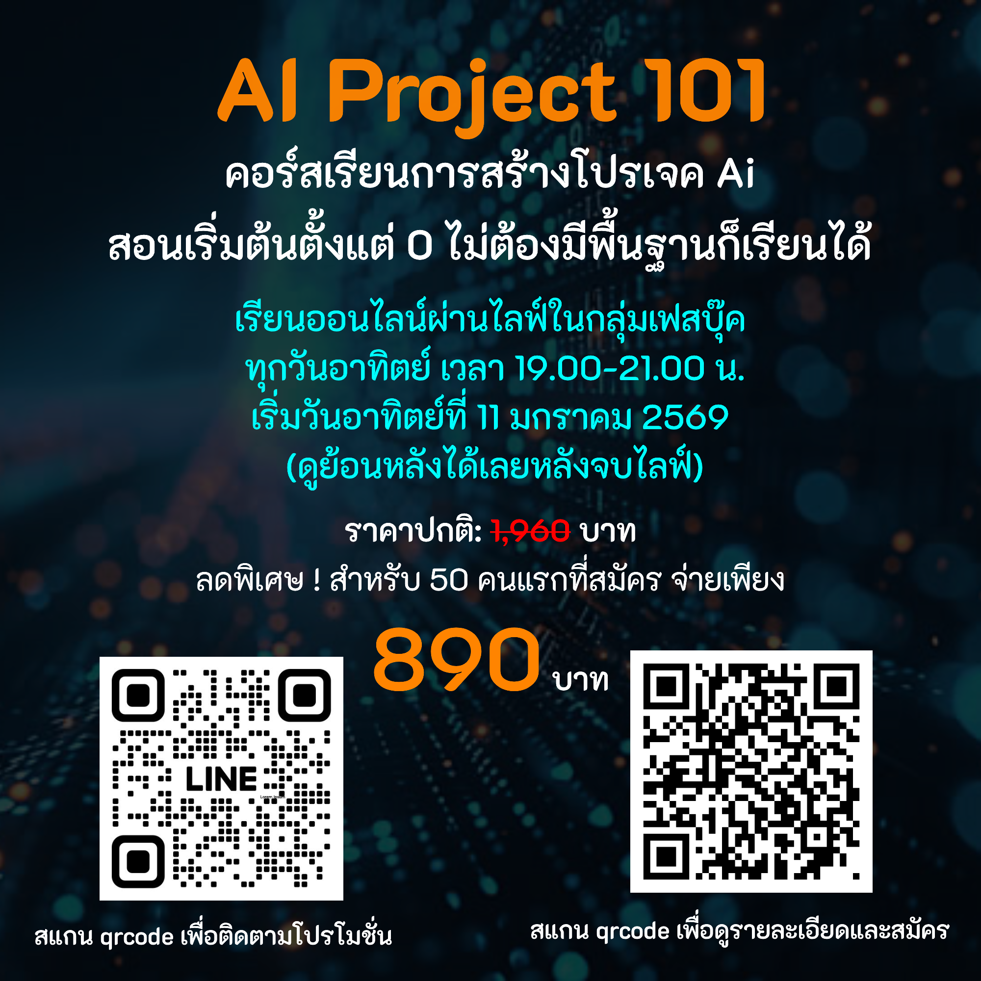 AI Project 101 คือคอร์สที่ออกแบบมาเพื่อสอนให้ทุกคนสามารถสร้างโปรเจกต์ AI ได้จริงตั้งแต่ศูนย์ โดยไม่จำเป็นต้องมีพื้นฐานมาก่อน เนื้อหาครอบคลุมตั้งแต่การเข้าใจแนวคิดของปัญญาประดิษฐ์ (AI), Machine Learning และ Deep Learning ไปจนถึงขั้นตอนการวางแผนโปรเจกต์ การเก็บและจัดการข้อมูล การเทรนโมเดลด้วย Python และการนำโมเดลไปประยุกต์ใช้ในงานจริง เช่น Chatbot, ระบบรู้จำภาพ, ระบบวิเคราะห์ข้อมูล หรือ IoT อัจฉริยะ ผู้เรียนจะได้ฝึกสร้างโปรเจกต์ของตัวเองผ่าน Workshop ทุกสัปดาห์ พร้อมเรียนรู้เทคนิคการเชื่อมต่อโมเดลกับ Web App หรือ Hardware อย่าง Raspberry Pi เพื่อให้ AI สามารถทำงานในโลกจริงได้อย่างสมบูรณ์ คอร์สนี้เหมาะสำหรับผู้ที่ต้องการต่อยอดทักษะด้าน AI เพื่อสร้างผลงานจริงใน Portfolio, ใช้ในธุรกิจ, หรือสร้างนวัตกรรมใหม่ ๆ ที่ขับเคลื่อนด้วยเทคโนโลยีอัจฉริยะ โดยมีเป้าหมายให้ผู้เรียนสามารถเข้าใจระบบ AI ทั้งกระบวนการ ตั้งแต่แนวคิด การสร้าง การทดสอบ ไปจนถึงการ Deploy ใช้งานจริง